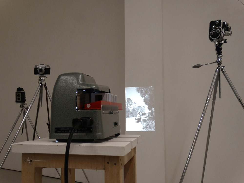 | Description: | Curator Maria Campitelli wrote about PERDUTO PADRE: This project arose from Fabiola Faidiga’s pain, due to the loss of her father, and her necessity to deal with it and share it with other people/artists, in order to develop a plot of evocations, memories, assertions and analysis. These elements were supposed to reflect a want, a lack of what was but will not be anymore, and make it become art. Namely, it becomes a concrete witness of an ineluctable experience – death – and results in a constructive assertion and a range of propositions, enclosed in the complex sphere of art; prepositions that reassert the idea of life and the historical continuity in the succession of generations. The ten artists that accepted Faidiga’s invitation display different marks. They recalled what their fathers did, what their fathers mostly identified themselves with and what they, daughters and sons, mostly acknowledged in their father’s lives. About ‘Refocus' for PERDUTO PADRE My father spent a great deal of time documenting our family life but unfortunately we have very few photographs of him. This regret developed into a wish to focus closely on the photographs of him that do exist at different stages in his life, projected as a series of black and white 35 mm slides. A looped fragment of his rarely-seen first film made in 1964 was also projected, using his Bell & Howell Autoload Standard 8 film projector. Dad always carried a 35mm camera, a cine camera and a slide film camera, perhaps wanting to record and document everything that mattered to him, or possibly feeling more himself with a camera at hand. His earliest cameras from the 1950s-60s are shown on tripods in this installation: a visual presence of photography as process that represented one of his main interests away from work. The sounds of the whirring reels of the Bell & Howell Autoload Standard 8 film projector, and the sensation of seeing dust particles lit up in its beam, are well remembered from our childhood. The section of unedited Standard 8 footage projected within the installation is at the start of his first film made in 1964, and shows my younger sister and myself ( aged 3 ) playing in our garden in Keston, Kent. We are trying to interrupt the process of being filmed by pouring water on his feet on a sunny day, and so negotiate a mutual space for play. Pushing me on the swing while filming, Dad captures movement in a more experiential way. Re-seeing these unedited silent film reels has been interesting, as the edited sections became overseen when transferred to low quality video with classical music that changed their meaning: the actual footage restages our narratives in different ways. Projected through a 1958 Liesegang Fantax-Automat slide projector, the images of my father are seen in context and then in further detail: attempting to refocus through close ups on seeing him more clearly. He is shown as a boy and then after a four year internment in a Prisoner of War camp in Germany during his early twenties. His outraged memories of seeing a friend being shot while drawing from a window at Oflag V-B may have led directly to his early support of my chosen life as an artist, alongside my Mother’s encouragement. My parents are seen holding hands for their engagement photograph in front of a ferry to Brittany, echoed again in the last photo taken of Dad standing, at their Golden Wedding Anniversary in 2003. Dad fell and broke his hip a month later, and Mum cared for him at home against hospital advice for five more years before he died in 2008. His presence still seems to be part of our lives particularly preparing for this exhibition. |