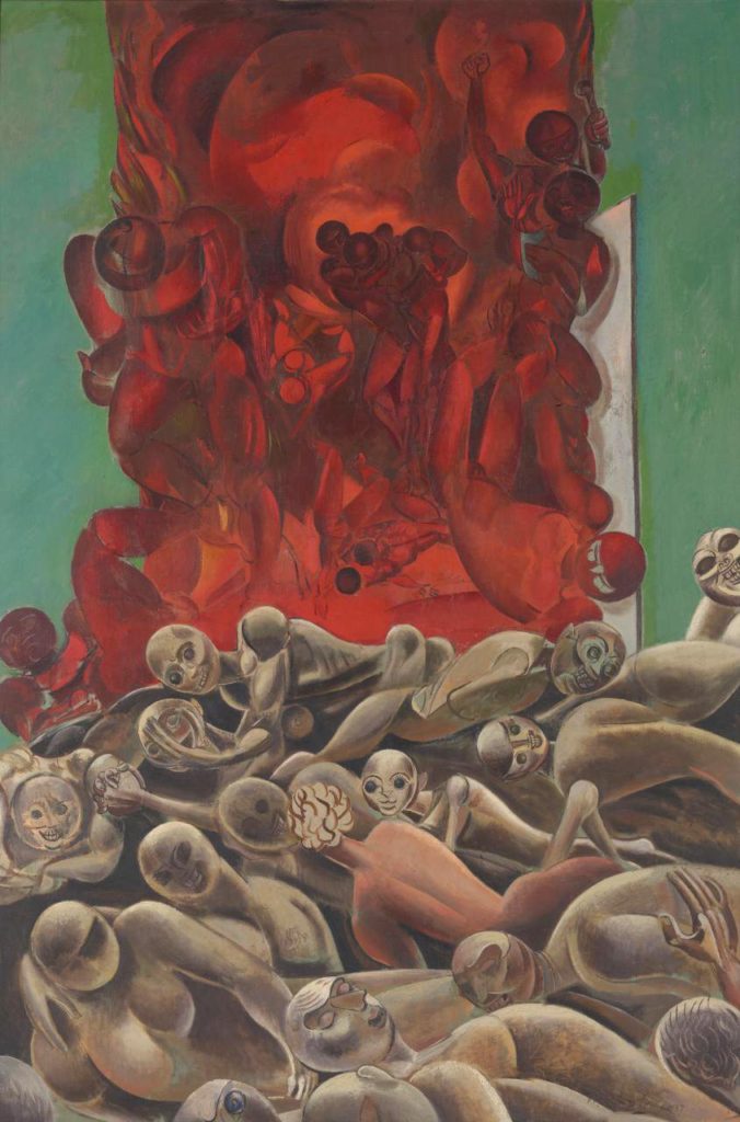 As if to offer a chilling conclusion to that division and the thrall-like violence of the blank figures we see ‘Inferno’ (1937). This image might be the outcome of the drone conflict in ‘The Crowd’, a great pillar of blood red emanates from piled up bodies whose dead faces seem to mock the viewer’s assumed sympathy. There is also something unsettling in how that image seems to predict a scene which, while fantastic at the time, would become real in the years to come with the full extent of nationalism, WW2 and the Holocaust yet to unfold.