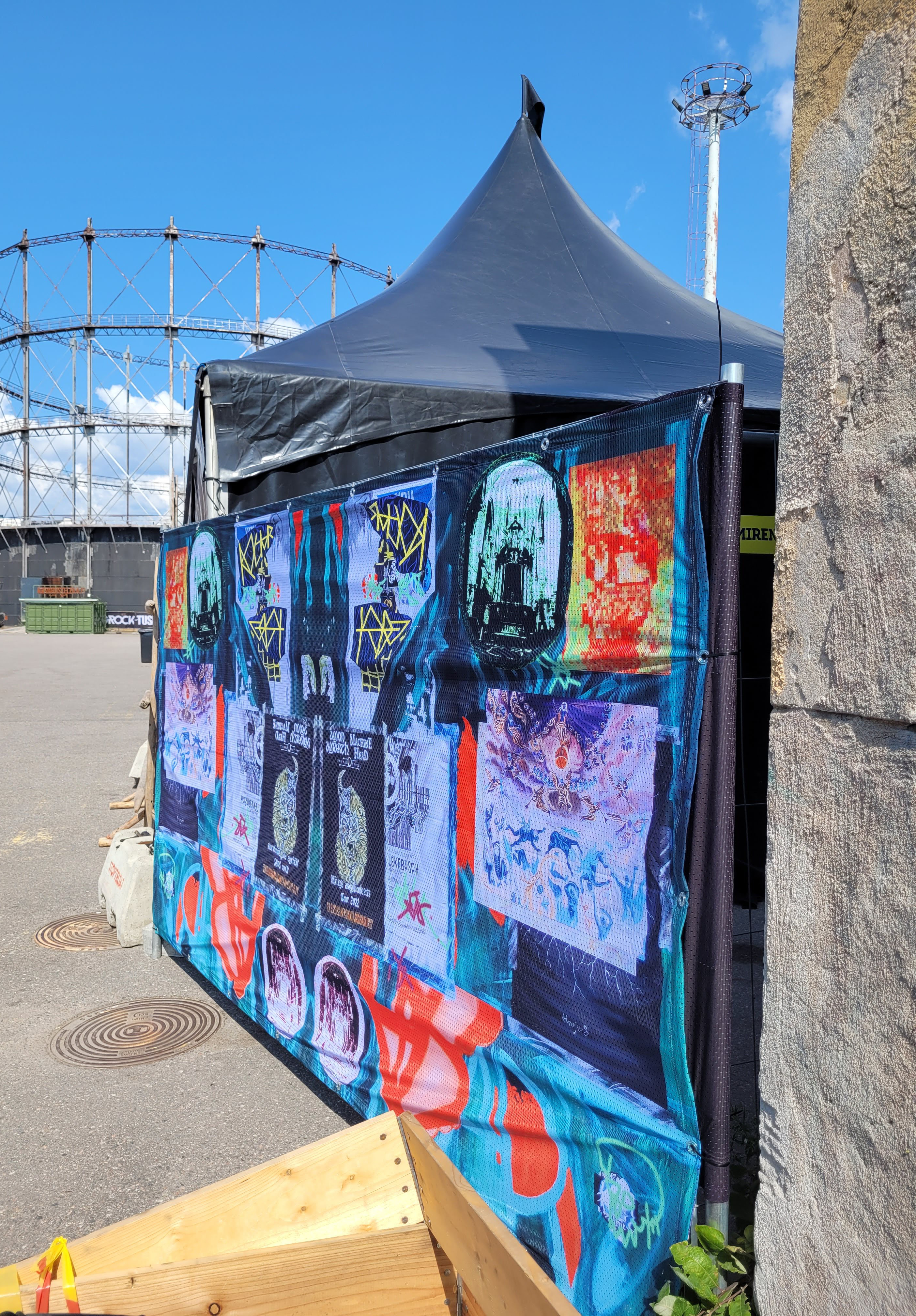 | Description: | An exhibition of banner artworks at Tuska music festival, Helsinki 30 June - 2 July 2023. The banners each measured 340 x 190 cm and were produced as digital prints on fabric. The images combined many elements from original oil paintings, reflecting the themes of heavy metal, folklore, heritage and history which characterise the Tuska festival. Tuska Open Air Metal Festival, commonly shortened to Tuska (Finnish: pain, agony), is a Finnish heavy metal festival taking place annually in Helsinki. The first Tuska took place in 1998 and the festival has since grown larger every year. Since 2011, Tuska has taken place at the Suvilahti event field in the Kalasatama neighbourhood of the Sörnäinen district. In recent years the attendance has grown and the festival has drawn up to 63,000 people in 2023. |