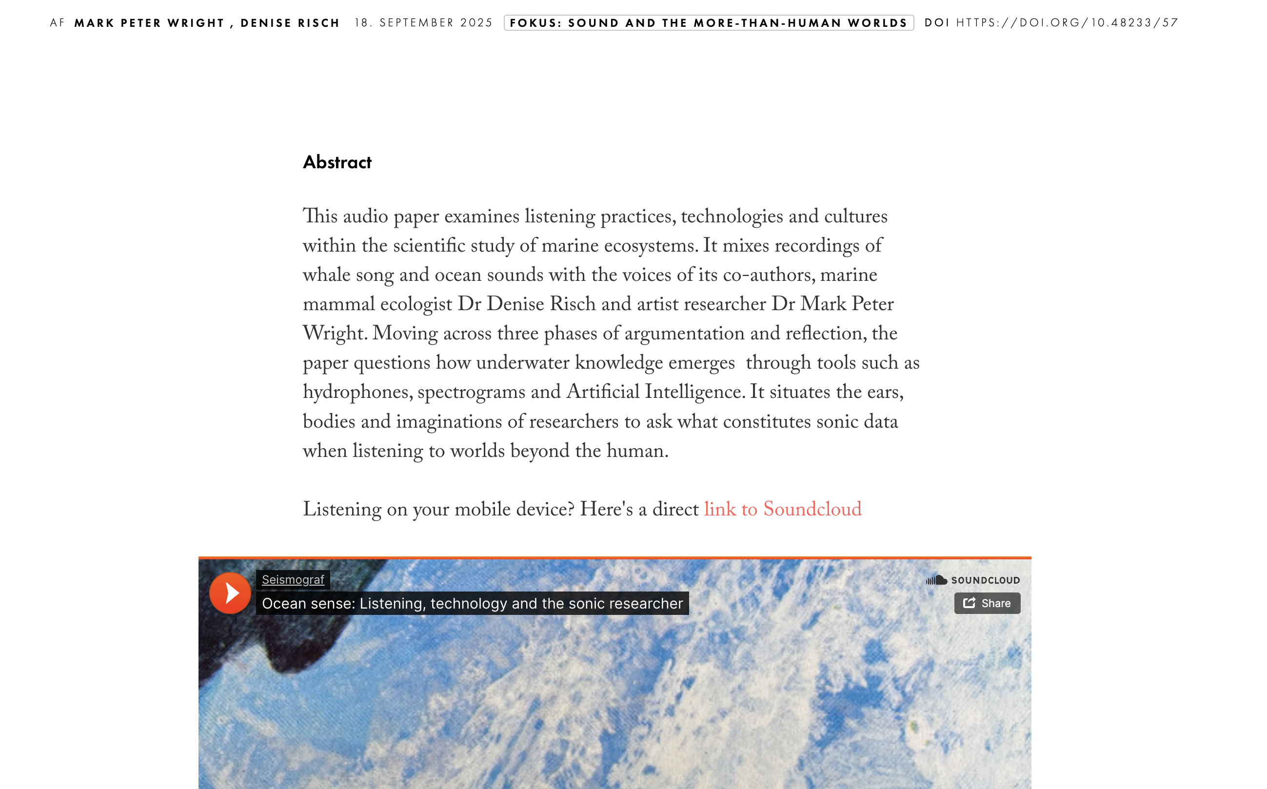 Description: | This audio paper examines listening practices, technologies and cultures within the scientific study of marine ecosystems. It mixes recordings of whale song and ocean sounds with the voices of its co-authors, marine mammal ecologist Dr Denise Risch and artist researcher Dr Mark Peter Wright. Moving across three phases of argumentation and reflection, the paper questions how underwater knowledge emerges through tools such as hydrophones, spectrograms and Artificial Intelligence. It situates the ears, bodies and imaginations of researchers to ask what constitutes sonic data when listening to worlds beyond the human. Part of Seismograf Peer: Sound and the More-Than-Human Worlds |