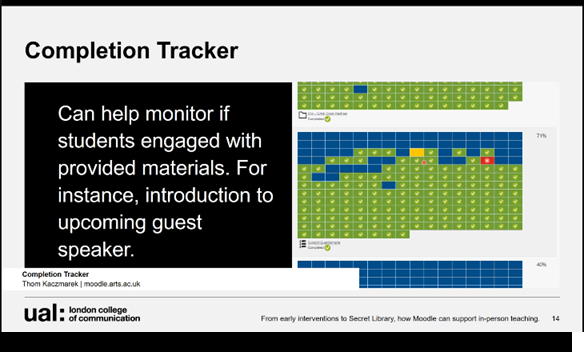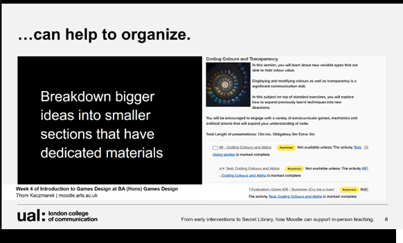 Kaczmarek, Thom (2023) From early interventions to Secret Library, how Moodle can support in-person teaching. In: ExEd 2023, 3-4 July 2023, University of the Arts London.