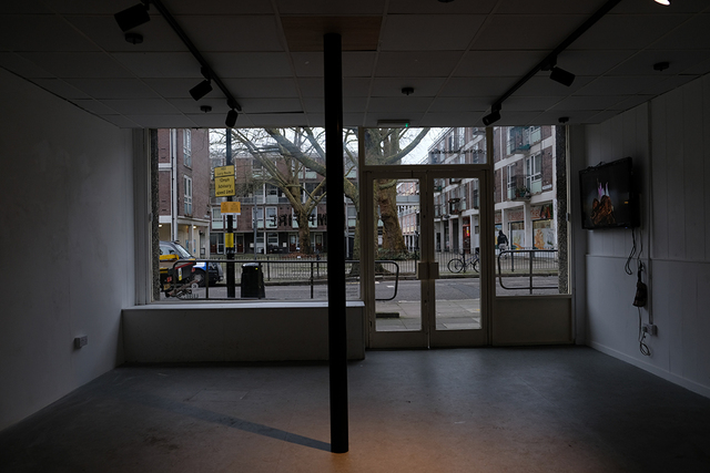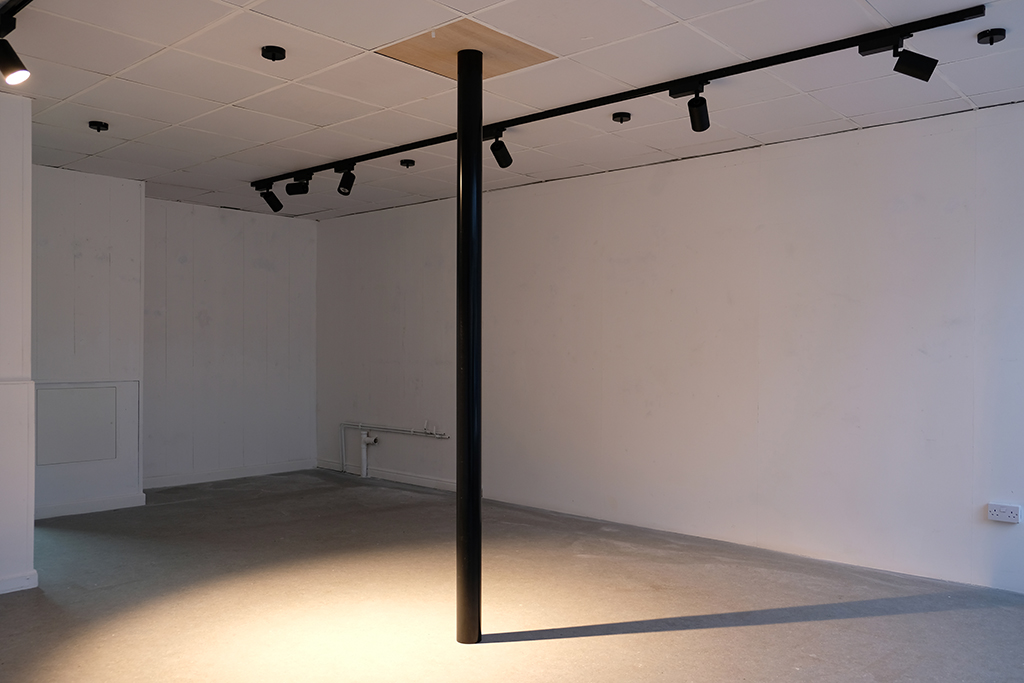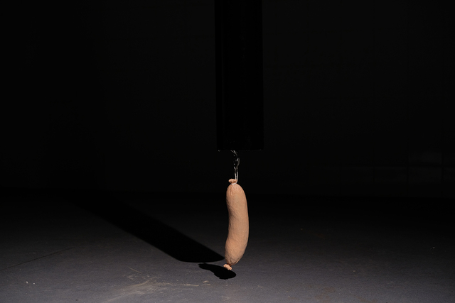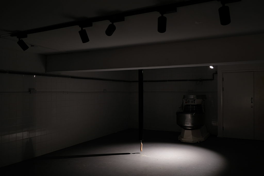 | Description: | The installation punctures the exhibition space, a decommissioned bakery, through the intervention of a soil—or, waste—pipe that links the ground floor to the basement. At the end of the pipe hangs a solitary hand-carved wooden sausage. The work, titled Transmitter, employs formal operations of piercing and suspending, while simultaneously moving viewers down and through the space. |