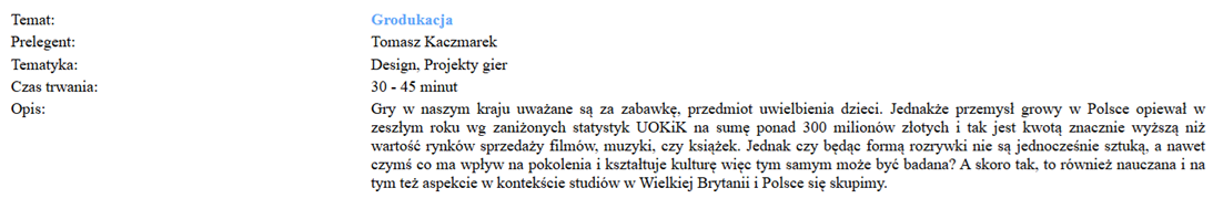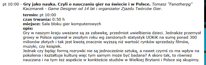 Kaczmarek, Thom (2011) Games as a Science: Teaching Games Around the World and in Poland [Gry jako nauka. Czyli o nauczaniu gier na świecie i w Polsce]. In: Polcon 2011, 25-28 August 2011, MTP, Poznań, Poland.