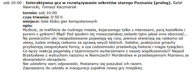 Kaczmarek, Thom and Nawrocki, Rafał (2011) Interactive game of solving the secrets of old Poznań (prologue) [Interaktywna gra w rozwiązywanie sekretów starego Poznania (prolog)]. In: Polcon 2011, 25-28 August 2011, MTP, Poznań, Poland.