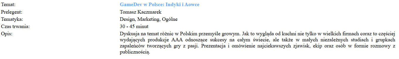 | Description: | A discussion about the differences in the Polish gaming industry. A behind-the-scenes look at not only large companies, increasingly releasing globally successful AAA productions, but also small independent studios and groups of enthusiasts creating games out of passion. A presentation and discussion of the most interesting phenomena, teams, and individuals in the form of a conversation with the audience. === This talk was also presented at the 4th Zjazd Twórców Gier in September of the same year |