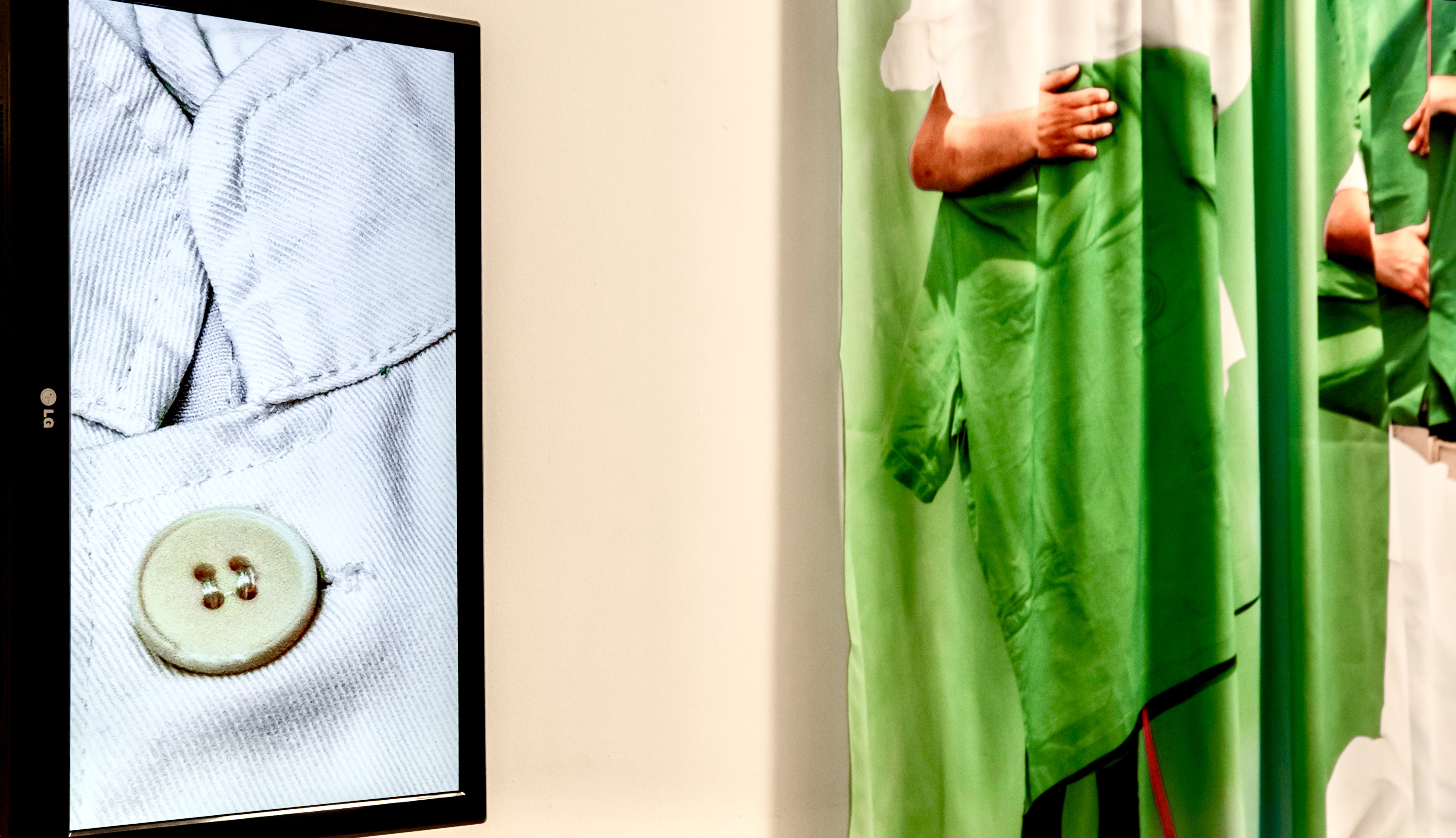 | Description: | As with some of my other work, in the case of New Treatment (see above), there’s a non-binary simultaneity of object and body, 2D thing and 3D thing, live thing and inanimate thing, however in this case the machine-eye of the camera-viewer-operator within this work and the clothing that this eye is examining don’t stand apart as subject and object but become intra-actively entangled, with these subject-object positions being more explicitly related to how a ‘worker’ might be perceived in certain situations. The work involves specific modes of looking and behaving that take cues from automated, AI, and machinic processes. Intertwining mechanical precision and tactile intimacy, the automated movement of the camera scans pieces of used medical workwear, slowly following joins, stiches and edges along pre-programmed paths. The camera lens, and therefore also the viewer, feel very close to the objects that are being observed. If the lens was an eye, it would almost skim the surface of the material, and so if the clothing had a body in it (which it has done, and normally does), this would be quite an intimate sort of contact – you’d sense body heat, breath, and scent, and slight movements. In part echoing the both the sophisticated medical machinery that belongs to this context, and the surgeon’s daily activity, it’s a meticulous and systematic type of viewing that’s seamless and microscopic – something that a human eye can’t quite manage, and yet in this work human subject and technological apparatus aren’t clearly distinct from one-another. The camera’s way of seeing might be detached, automated, at the same time as being generative and performative, therefore both active and reactive rather than simply one or the other. The close-up scrutiny of the body-clothing is something like an examination, but also like a caress. Can a machine look at, or examine a body, or an object, in a tender, empathetic or compassionate way? The originality of the work lies in its concern with a mode of looking, examining, performing, and working that incorporates the dispassionate gaze and systematic movement of artificial intelligence alongside a form of tenderness and sensitivity that we would hope is more readily associated with human or humane characteristics. This work continues an interest in work/labour as a aspect of human activity that simultaneously defines, deforms, valorises, and produces subjects or selves as much as it generates objects, commodities and services. |