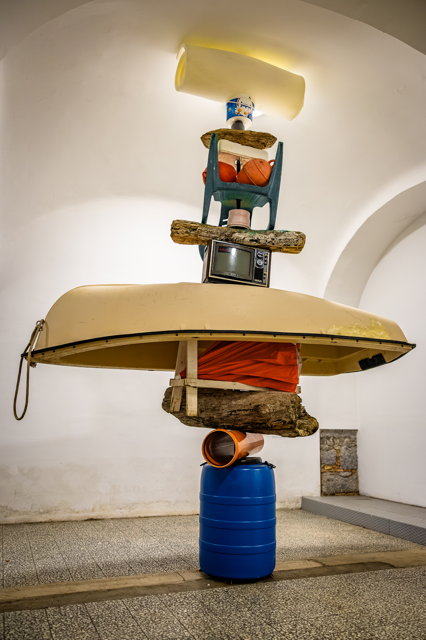 | Material/Media: | Installation with bricks, boat, wood, pipes, tents, TV monitor | ||||