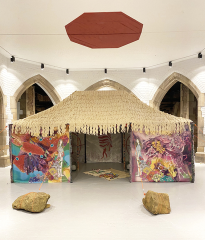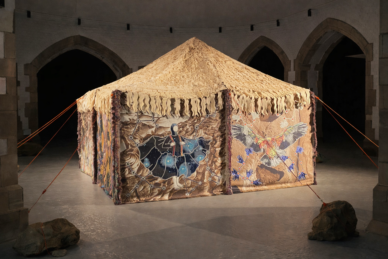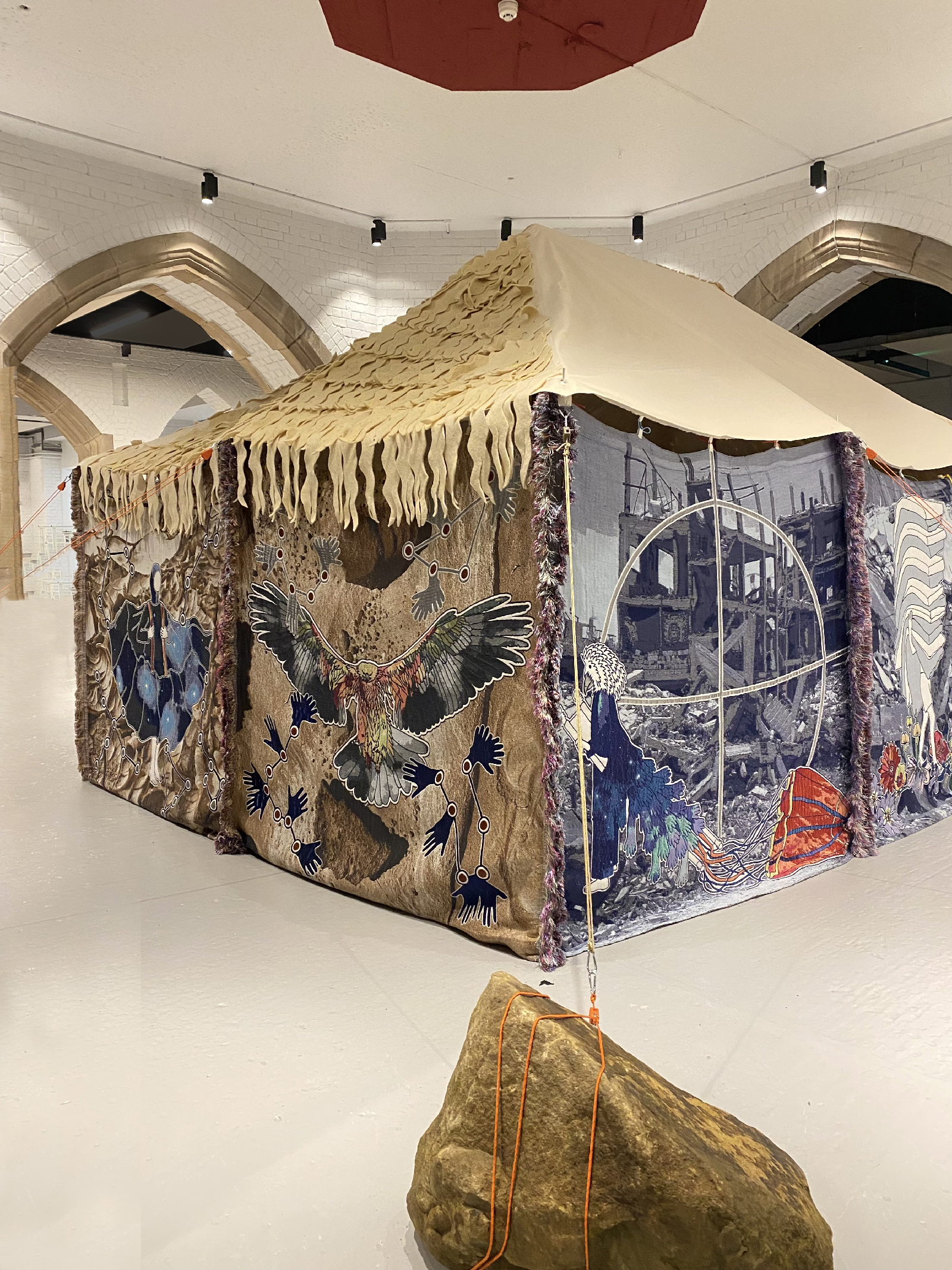 | Description: | ‘Bayt Al Sha’ar – House of Hair’ (2025) is an ambitious textile sculpture by visual arts researcher Lucy Orta, inspired by the traditional Bedouin dwelling and developed through fieldwork undertaken in Saudi Arabia. The work investigates how vernacular architecture and weaving traditions—particularly the Saudi Arabian practice of Al Sadu—can inform ways of living in harmony with extreme environments. After meeting Al Sadu weavers, rather than hand weaving, the tapestry walls of the sculpture were developed during a period of exploratory research at the TextielLab digital weaving laboratory in the Textile Museum Tilburg. The outcome is a series of nine visually complex jacquard panels (170 × 170 cm each), woven in wool, recycled PET and silver thread and incorporating over one hundred colours, innovating traditional weaving capabilities. The tapestry panels are assembled using traditional methods to form the walls of a tent based on the Bedouin structure known as bayt al sha’ar. The canvas roof is covered in wool felt, to create the effect of the sheep fibre (hair). The visual iconography of the jacquard panels forms a speculative narrative depicting a world reshaped by desertification and resource scarcity—where conflict and displacement become increasingly inevitable. Yet amidst these imagined ruins, resilient desert species and mythic figures emerge, offering gestures of hope and renewal. The tent-sculpture stands as an emblem of migration and adaptation in a world transformed by climate disruption. The imagery is constructed through a process of collage, combining Lucy's field research photography with hand drawing, and assembled using digital editing techniques. The collage compositions include desert landscapes from Saudi Arabia, diverse ecosystems (in the Amazon and the Al’Ula desert), desert plant species, and celestial motifs referencing Bedouin cultural symbolism. These elements are interwoven with open-source imagery of ruined environments to construct a layered visual narrative. The tapestries at the entrance depict Gaia, the earth goddess, who welcomes viewers into the majlis space. Surrounded by constellations and the Pleiades star cluster, she evokes ancient traditions of celestial navigation. Moving around the tent, subsequent tapestries introduce desert dwellers such as the Imperial Eagle and the Flying Man—figures capable of surviving hostile conditions. Other scenes depict a bird-like character dragging a parachute across a devastated landscape and another carrying personal belongings while emerging from rubble. The final panels present the Water Gatherer and the Seedling Spirit, nurturing new life within desolate terrain. The narrative cycle ultimately returns to Gaia, suggesting regeneration and the possibility of alternative futures. ‘Bayt Al Sha’ar – House of Hair’ was commissioned for the 2025 British Textile Biennial (2 October – 2 November 2025) and forms the pivotal artwork in the survey exhibition ‘Homo Mondialis’, which showcases Lucy Orta’s textile-led practice over the last twenty-years. |