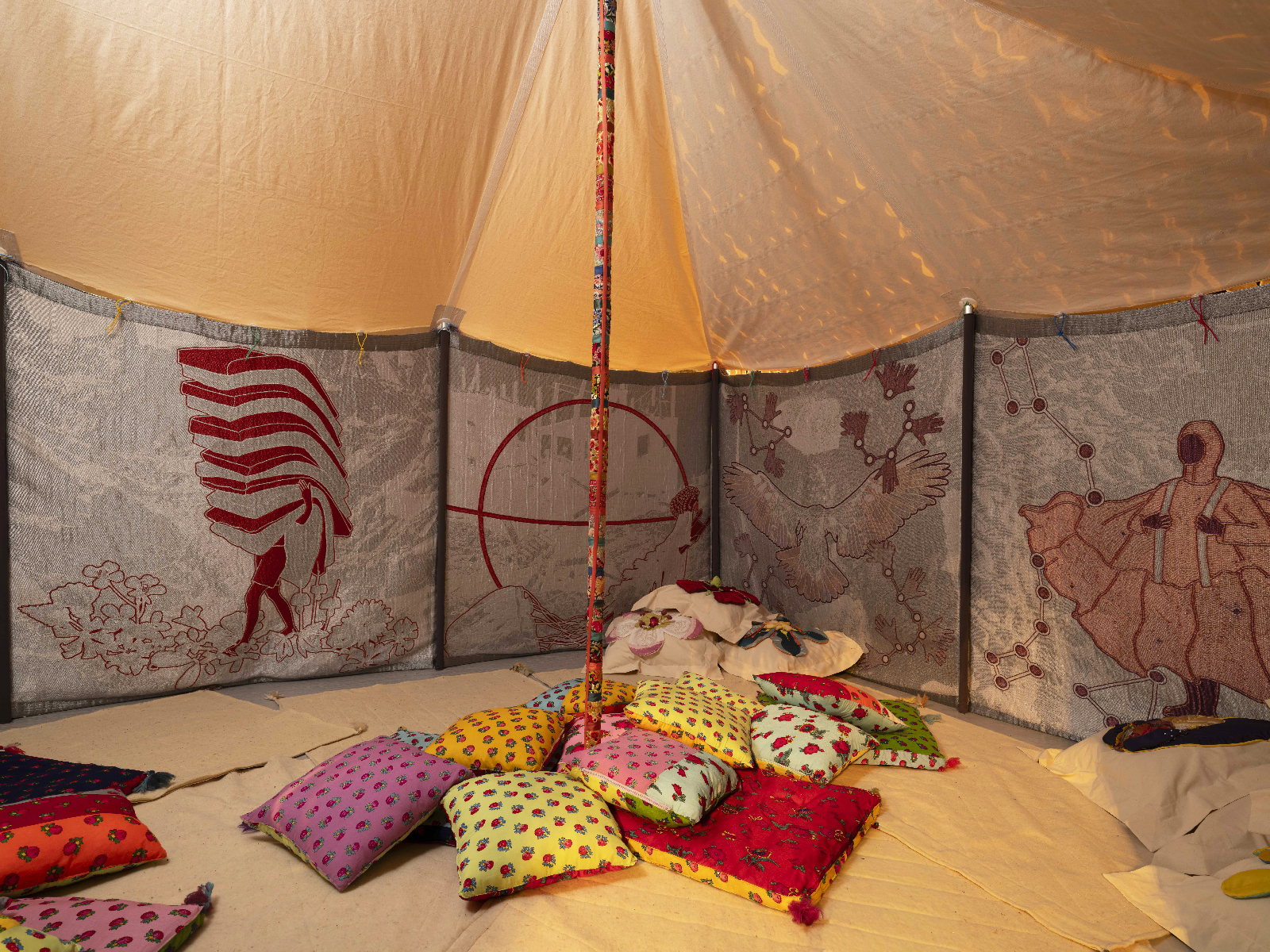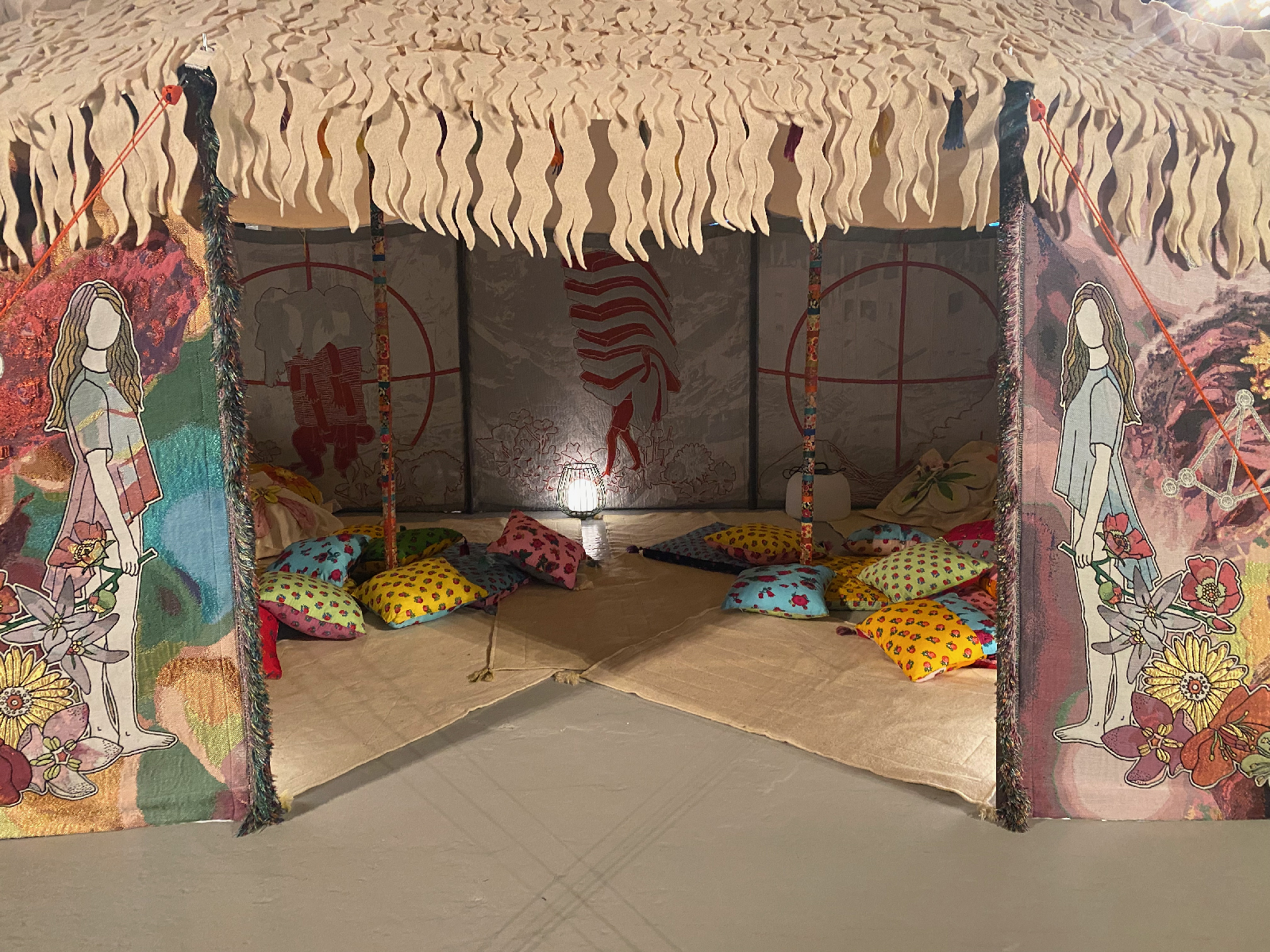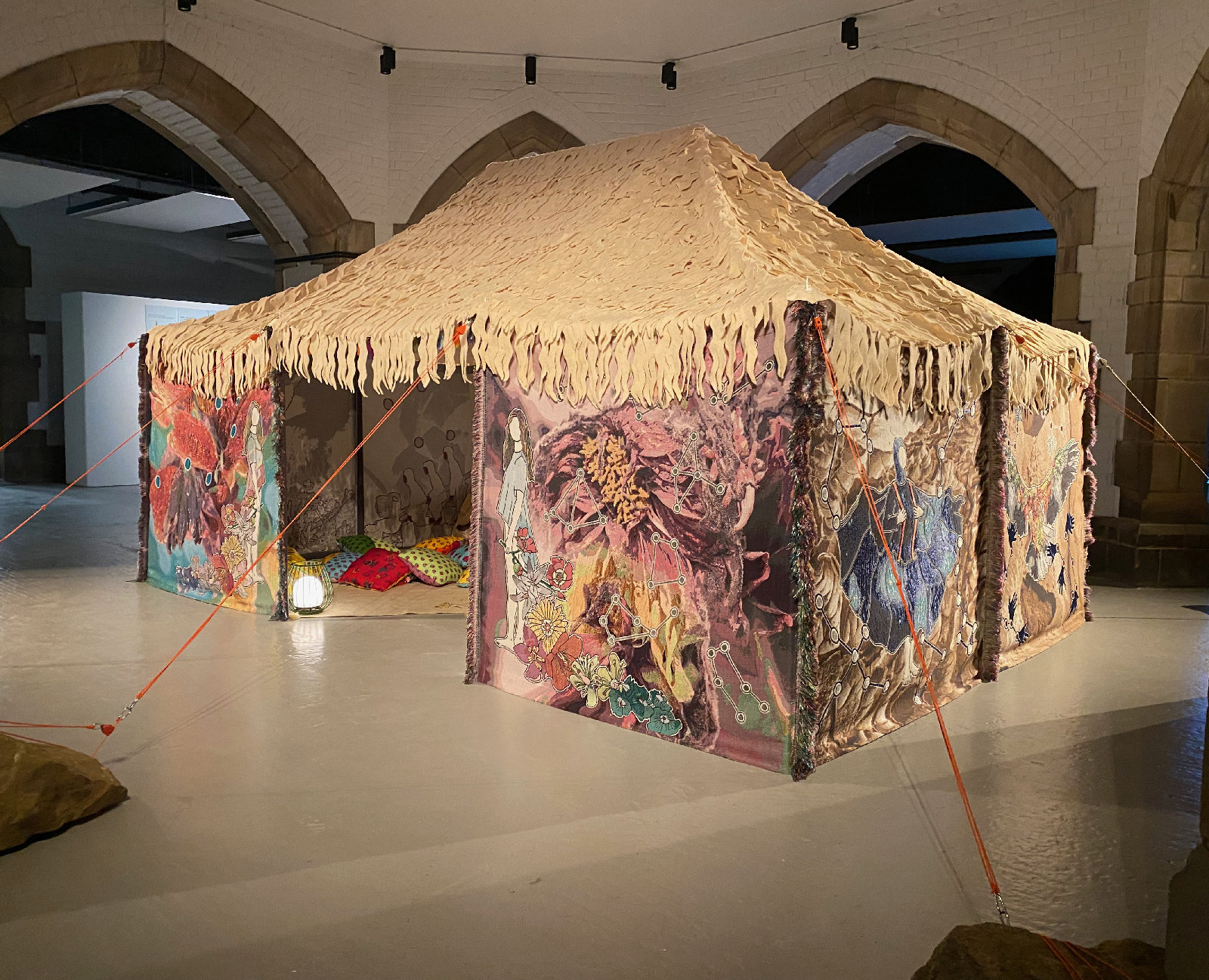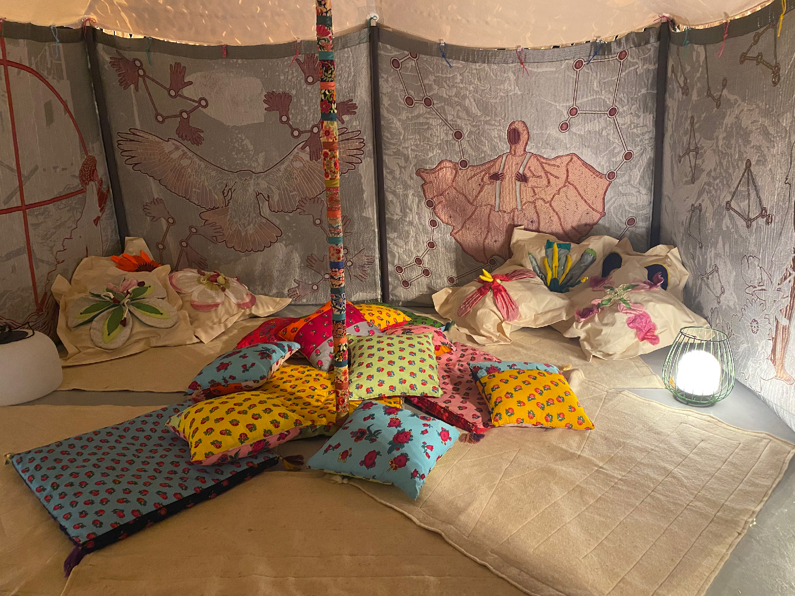 | Material/Media: | Wool, Elirex silver thread and recycled PETT, aluminium structure, cotton canvas roof, raw wool fleece, various cusions, guy ropes, locally sorced stone anchors | ||||||
