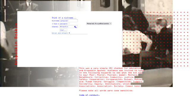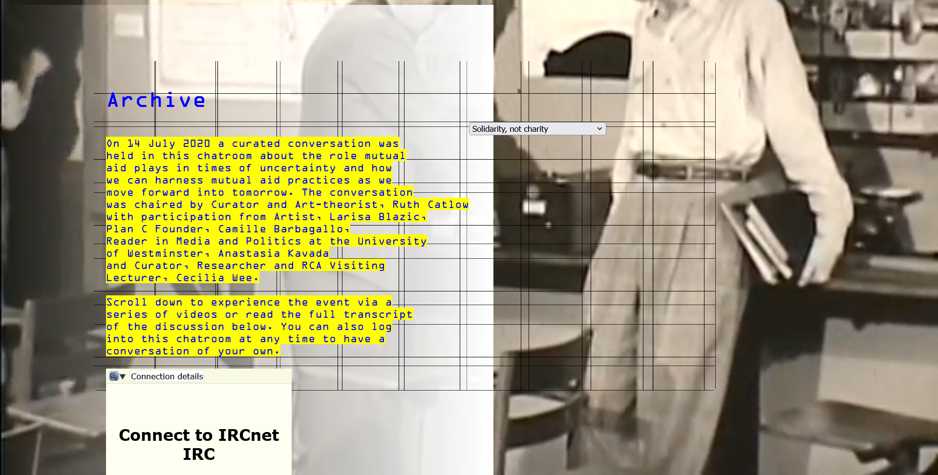| Description: | Common Bond Society is a web-based digital artwork that takes the form of a series of Internet Relay Chat (IRC)* rooms, built in response to the COVID-19 pandemic. The project explores the implications of our increased dependence on the Internet as public space and investigates the Internet’s potential to offer safe spaces to discuss, disseminate and carry out acts of mutual aid. It is brought to you by artist Larisa Blazic for UP Project’s digital commissioning strand, This is Public Space. |