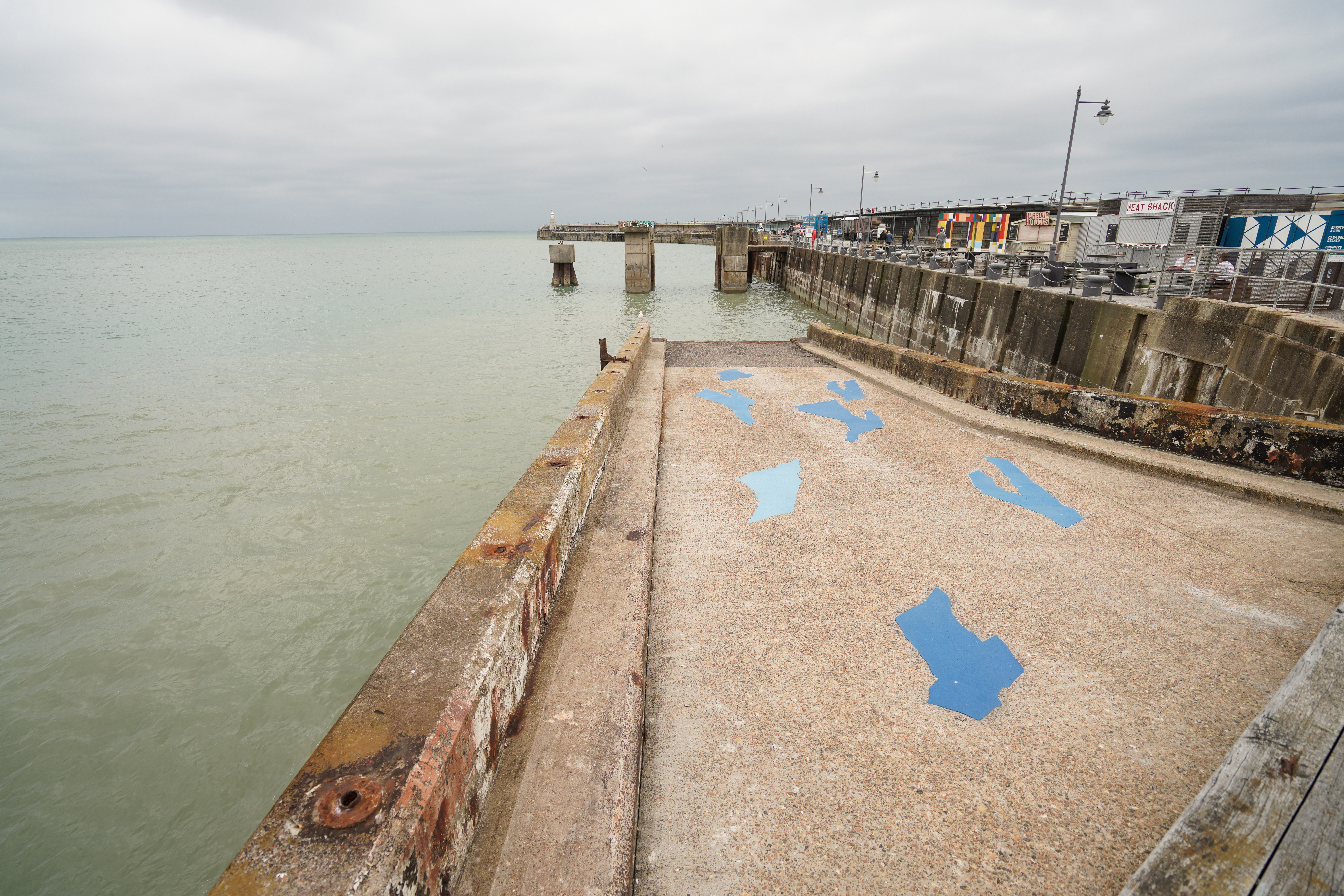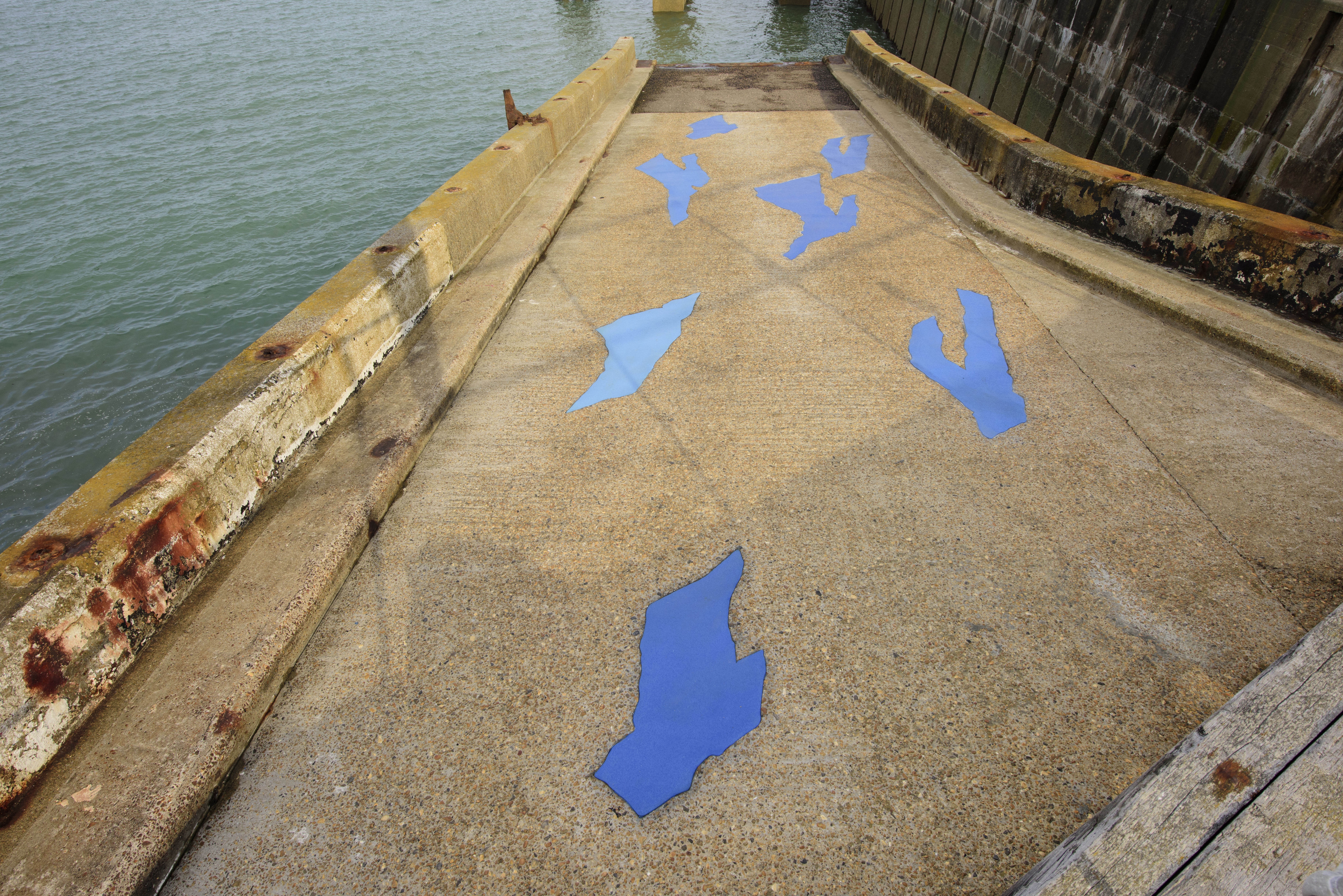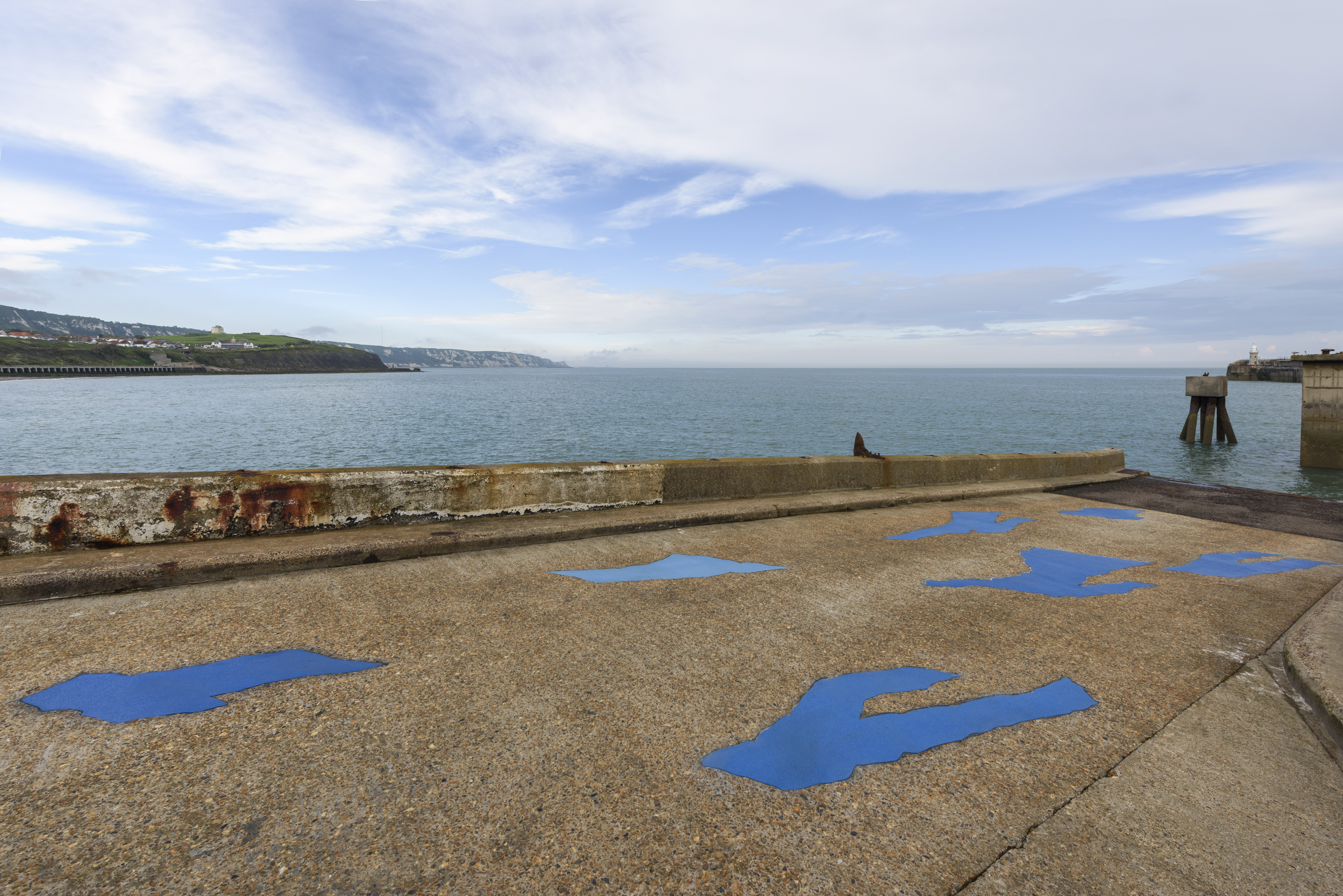 | Description: | Surface Flows Permanent public sculpture, Folkestone Triennial, United Kingdom. Curated by Lewis Biggs Surface Flows is located on what remains of the traffic access ramp for the roll-on roll-off ferry, which for a period of forty years in the last century was the heartbeat of Folkestone, the epicentre of the town’s economy and connectedness to continental Europe. Incised into the surface of this concrete roadway she has created images of a number of discarded items of clothing – some pairs of jeans, a dress, T-shirt s – all in very slightly varying shades of the same blue (just as the blue of denim jeans may vary subtly however much it clings to the singular concept of blue). The materiality or sensuality of the clothing is signalled by the use of heavy road-marking paint, wholly appropriate to the roadway in which these items lie. The concrete is washed by the tides, and the items of clothing remain, seemingly fragile but unmoved, somehow monumental despite our knowledge that these are the most ephemeral vestiges of the people that once wore them. The title Surface Flows directs our attention away from the promise of an individual narrative held by the materiality of the work, and towards the most generalised speculation as regards the situation. Are these items of clothing discarded by the fashion industry? Or are they evidence of some fishing or shipping disaster? Or of some tragedy sustained by migrants? Lacking answers, we have to accept that all of these possibilities are with us all the time, as people and goods circulate endlessly across the surface of the globe, sometimes arriving and sometimes failing to arrive at their destinations. |