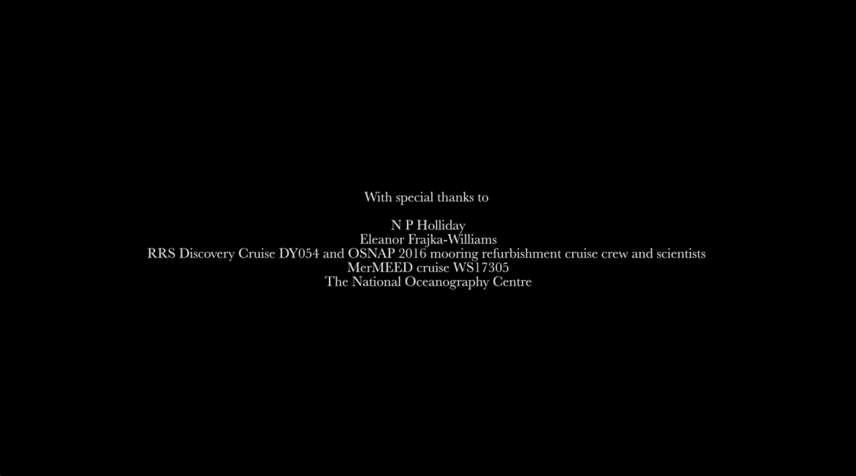 | Description: | A single channel film made in response to joining international researchers on a research expedition to the subpolar North Atlantic (2016). Led by scientists at the National Oceanography Centre, objectives included capturing data on Atlantic Meridional Overturning Circulation, a vital ocean current system which is weakening due to climate change. The film takes the audience on a journey to the depths of ocean floor. The film merges text with image, speaking directly to the viewer about the ocean environment and building a narrative that includes relationship stories. These include about the ocean dwelling non humans encountered on the journey and human impact on the ocean as a carbon sink. |