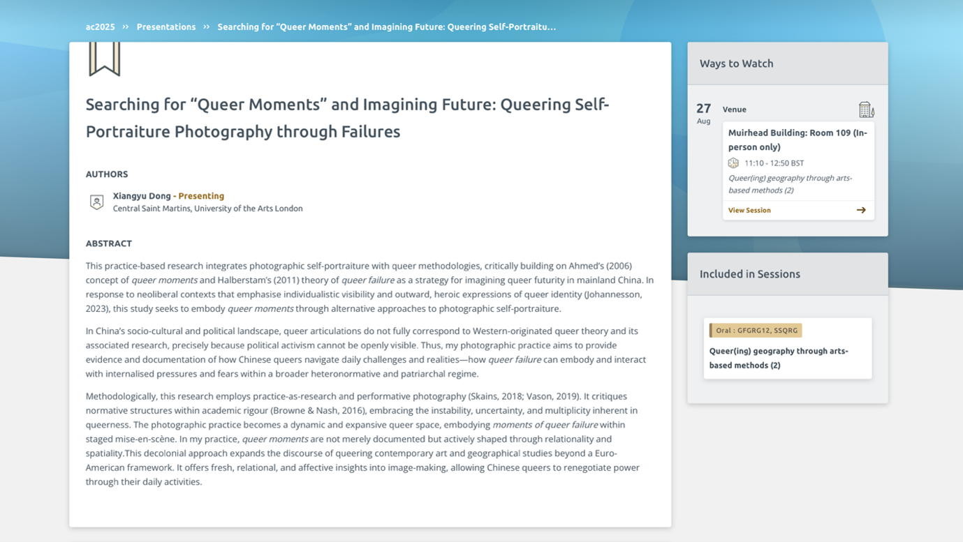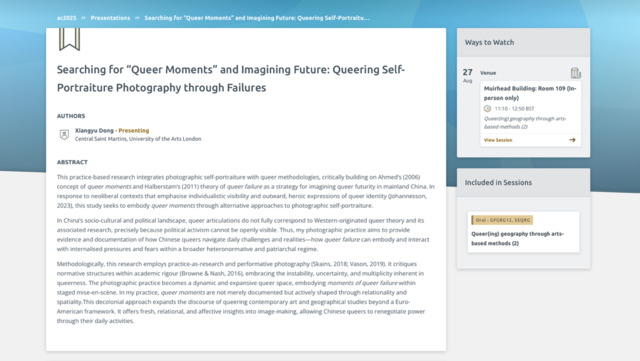 Dong, Xiangyu (2025) Searching for “Queer Moments” and Imagining Future: Queering Self-Portraiture Photography through Failures. In: RGS-IBG Annual International Conference 2025, 26-29 August 2025, University of Birmingham, Birmingham, United Kingdom.