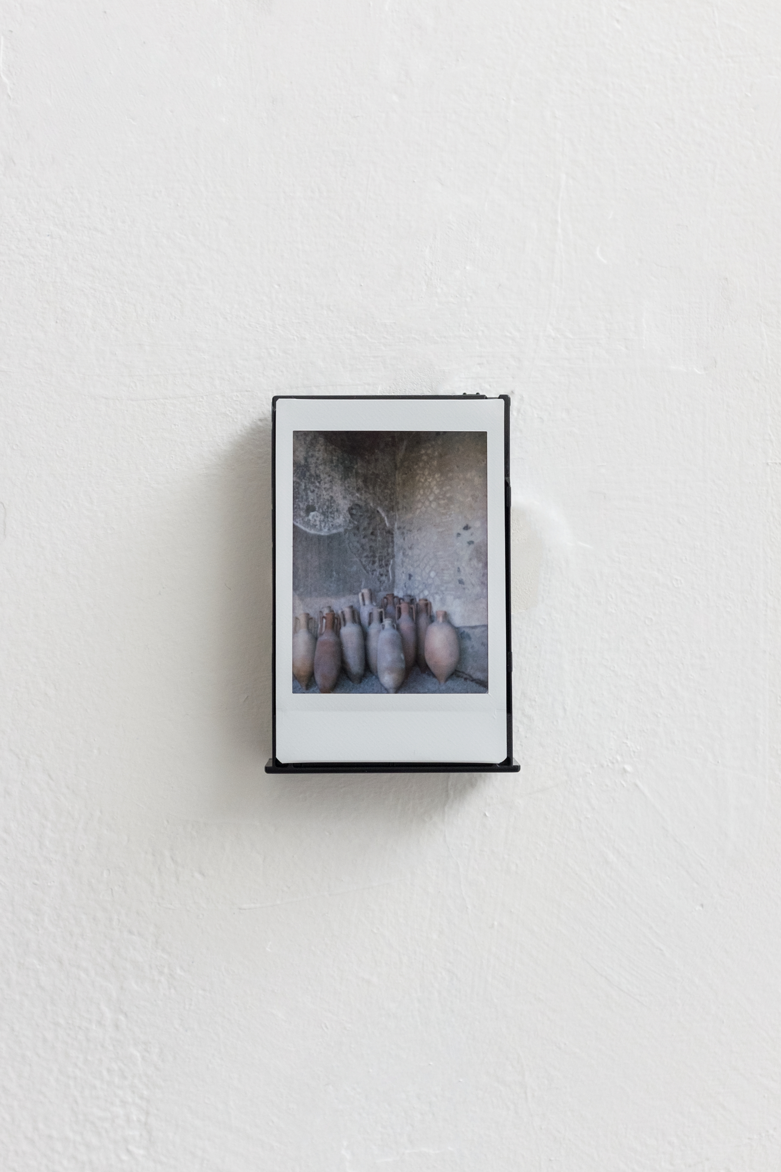 | Description: | This Polaroid forms part of a series made during visits to key sites in Pompei and Rome between September and December 2025. The image depicts Ancient Roman amphoras used for transporting oil, olives, food and wine. Titled after the site in which this amphoras were found, House of The Tragic Poet, Pompeii, is one of three Polaroids exhibited from a total series of 100 Polaroids which extend the space in which paintings and other artworks were exhibited. Through a folding and looping of time in low resolution black and white polaroid photographs where imagery and textures suggest ideas of memory and travel. |