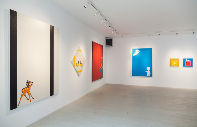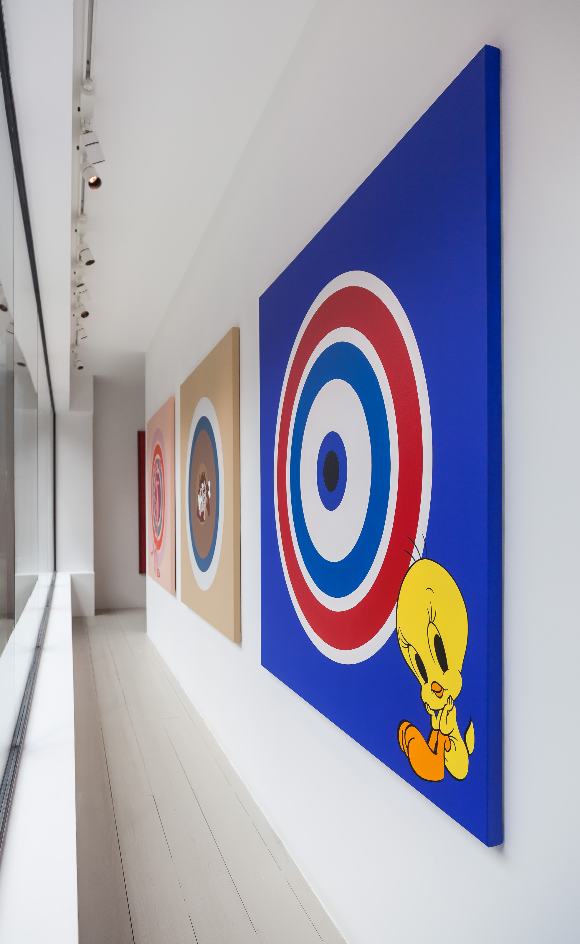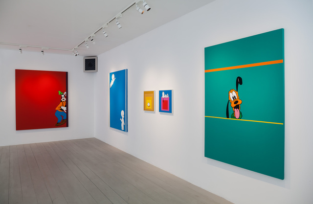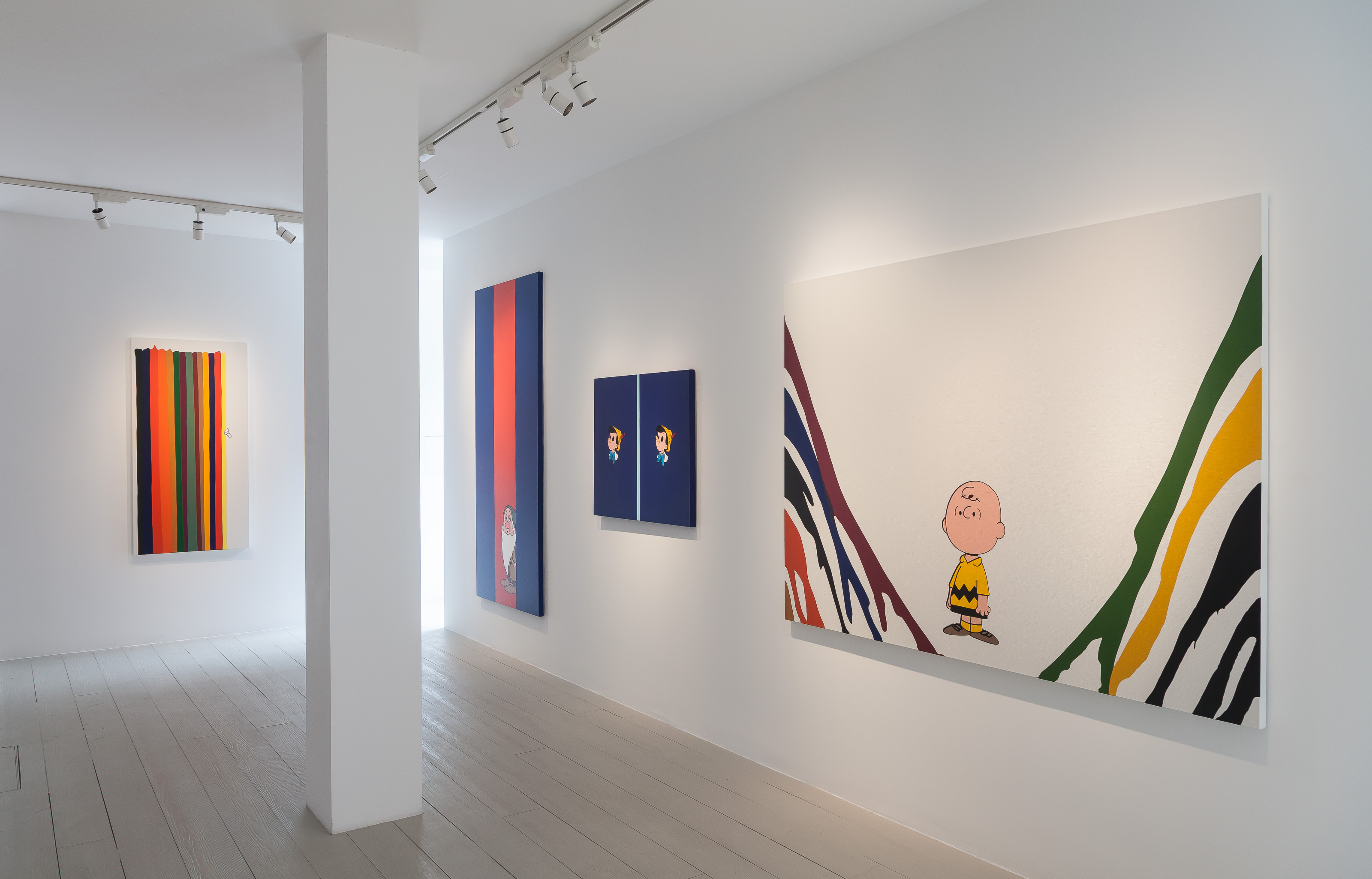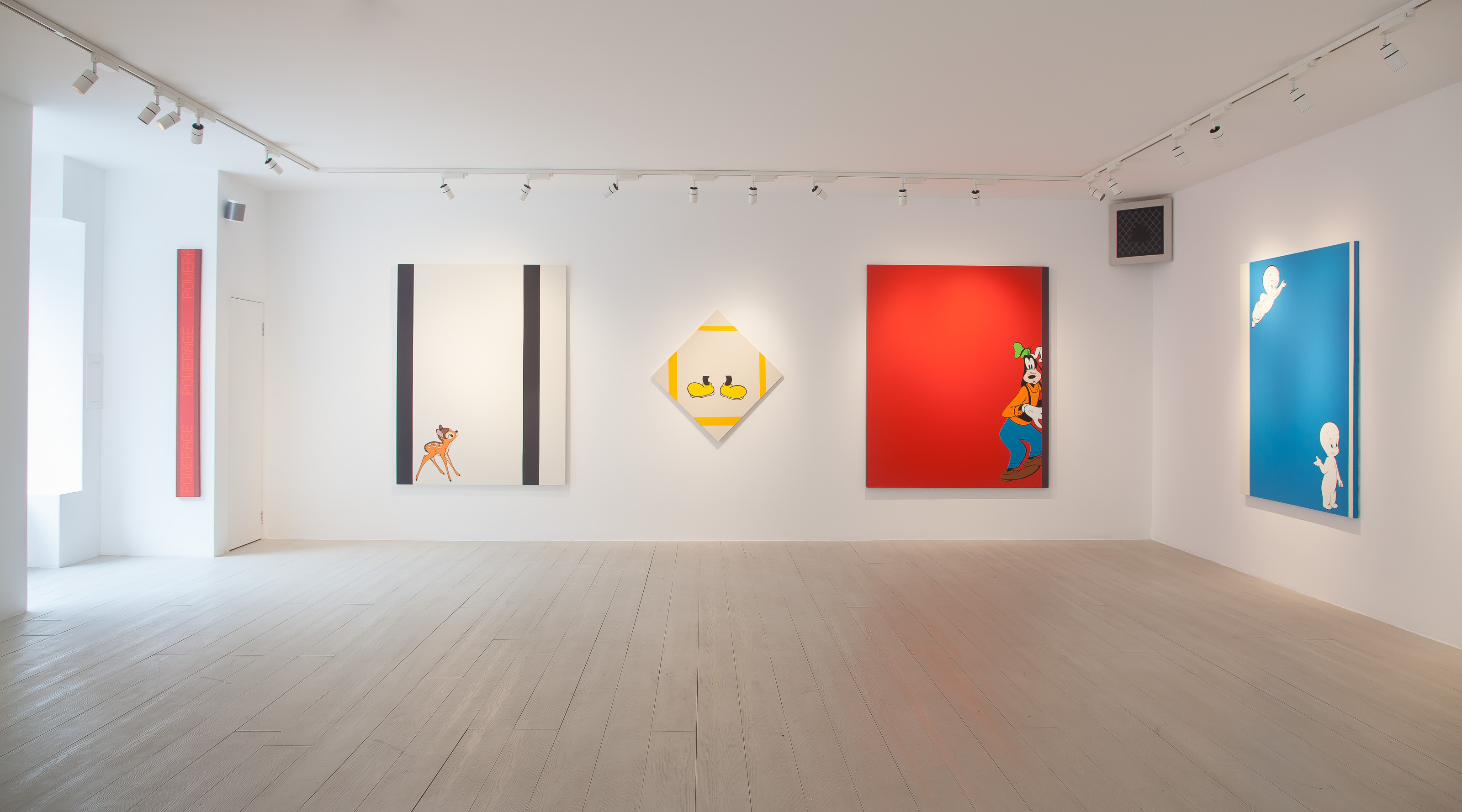 | Description: | Powerage (2021) was a was a solo exhibition at JGM Gallery, London, presenting 28 new works. This exhibition's researched early Renaissance painting and the Sienese School, to feed into the decisions of placing images upon re-enacted American Colour Field Painting, in particular the works of Barnett Newman, Morris Louis and Kenneth Noland, and earlier examples of the European Avant-Garde - Kazimir Malevich, Piet Mondrian and Josef Albers. This type of intertextuality reads at times like a far-fetched plot or absurd comedy involving Duccio, Snow White's Sleepy and Newman's 'zip' paintings. The motifs bring together comic strips and cartoons - the new forms of visual art that emerged in the 20th century - the modernist movement in Europe and Post-War Modernism in the US. These influences have created a rich and problematised zone where painting, abstraction, entertainment, popular culture and high modernism converge and overlap. |