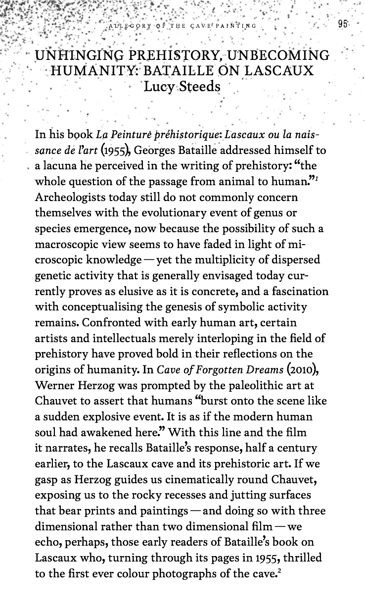 Steeds, Lucy (2015) ‘Unhinging Prehistory, Unbecoming Humanity: Georges Bataille on Lascaux’. In: Allegory of the Cave Painting. Extra City Kunsthal and Mousse Publishing, Antwerp and Milan, pp. 95-114. ISBN 9788867491162